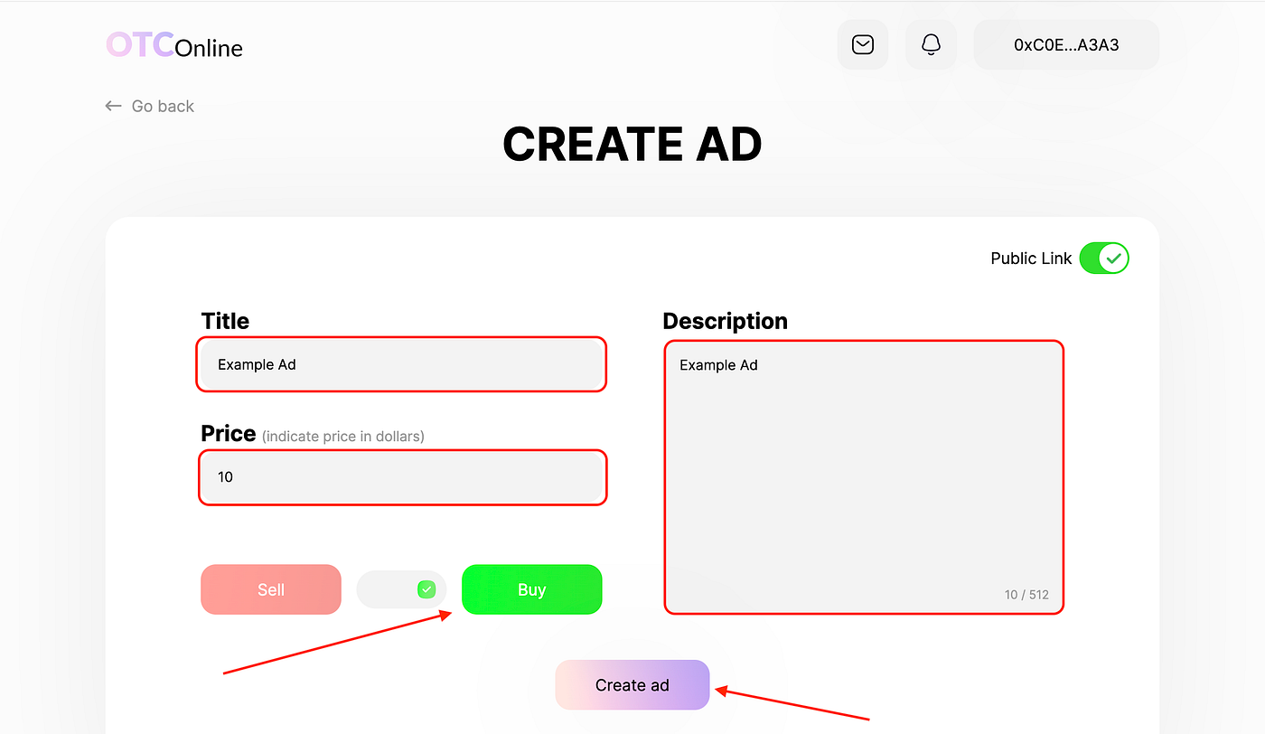2.3. В открывшимся окне введите название объявления (Title), цену (Price) и описание (Description). На данном этапе мы выступаем в роли покупателя, поэтому перетащите ползунок, чтобы он и параметр "Buy" стали зелеными, после этого нажмите "Create ad".