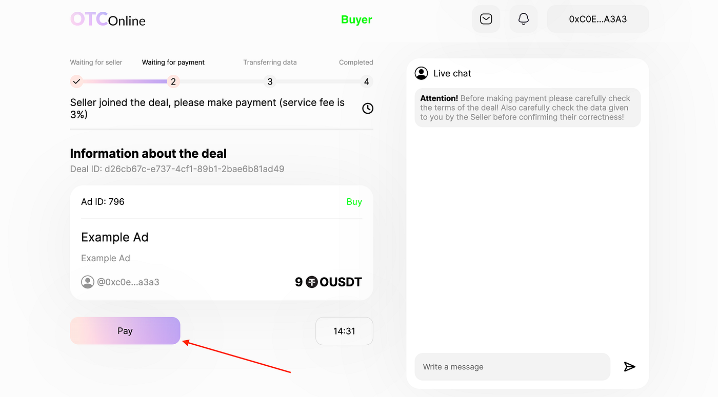 4.3. Когда оба участника находятся на странице сделки, сделка переходит ко второму этапу "Оплата сделки". Для этого с аккаунта покупателя (Crome) нажимаем кнопку "Pay" и подтверждаем транзакцию в Метамаске.