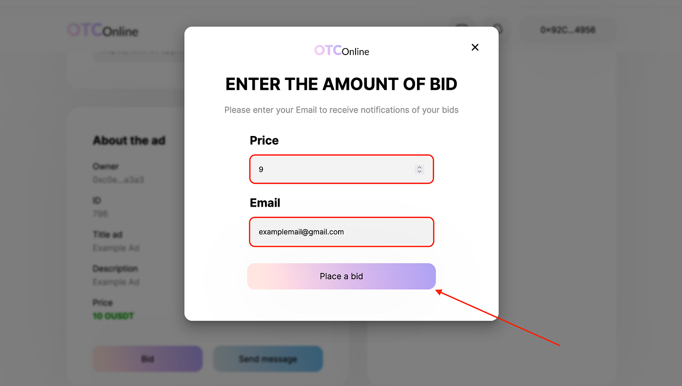 3.2. В открывшемся окне нажимаем "Bid", вводим цену, электронную почту и нажимаем "Place a bid". Почта нужна чтобы вы могли получать уведомления о ваших сделках.