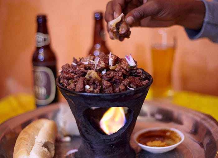 Когда у эфиопа спросишь про его любимое блюдо, ответом будет — мясо. Поэтому по всей стране кроме стандартных кафе очень много мясных заведений, где можно заказать только мясо и птицу. Возможно, хозяева этих заведений следят чуть лучше за свежестью мяса. Учитывая частое отсутствие холодильных камер в таких заведениях, я всего несколько раз заказывал жареное мясо там. Увы — желудок крутило каждый раз после :)