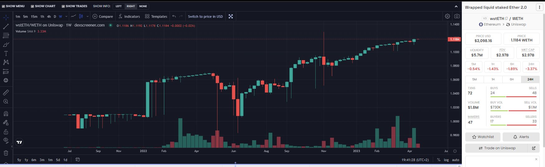 - Доходные LST. Многие LST являются доходными, например, wstETH. Этот актив будет расти в цене со скоростью ~4% годовых. Этот график предназначен для движения вверх и вправо против ETH