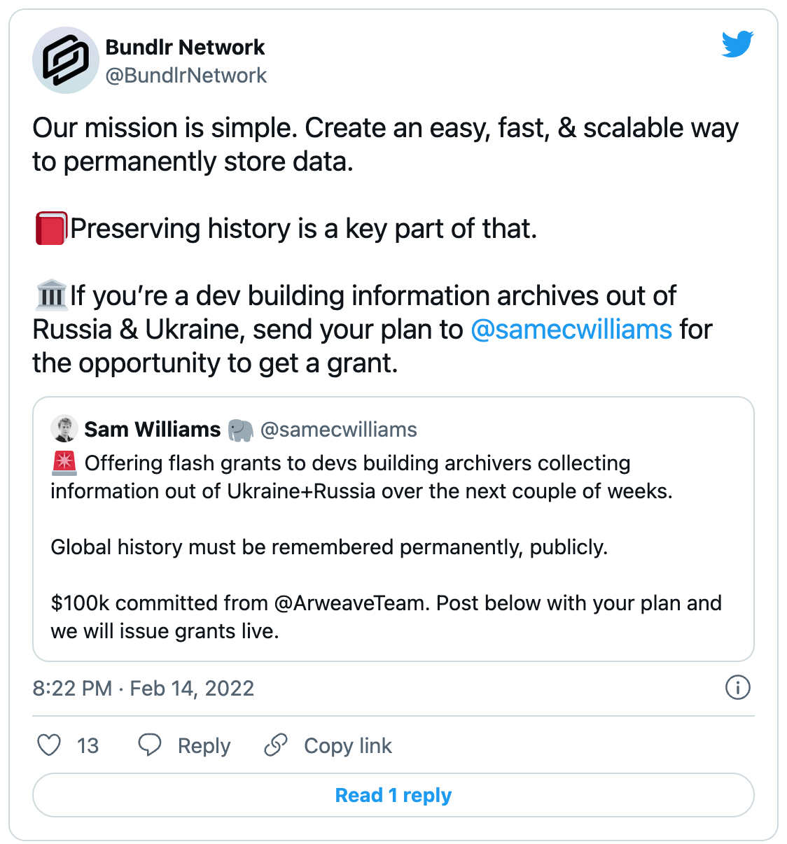 Мы продолжаем работать с Arweave, архивируя исторические данные из мест, которые традиционно подвергаются цензуре, включая Россию и Китай. Мы также продолжим предоставлять пользователям возможность присоединиться к нам и постоянно хранить фрагменты данных, которые они считают важными.