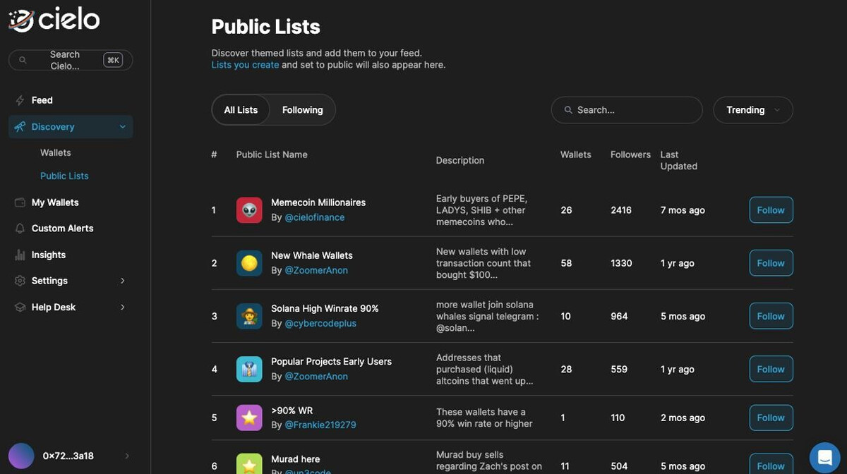 Cielo - объединяет передовые инструменты для мониторинга ончейн-транзакций, включая отслеживание EVM-кошелька. Инструмент упрощает анализ данных, фильтруя шум и оставляя только важноеПлатформа помогает выделять и сегментировать данные в блокчейне, подстраивая их под ваши интересы. С помощью нее можно легко отслеживать ключевые транзакции — свои, влиятельных лиц или крупных игроков, чьи действия могут влиять на рынки.