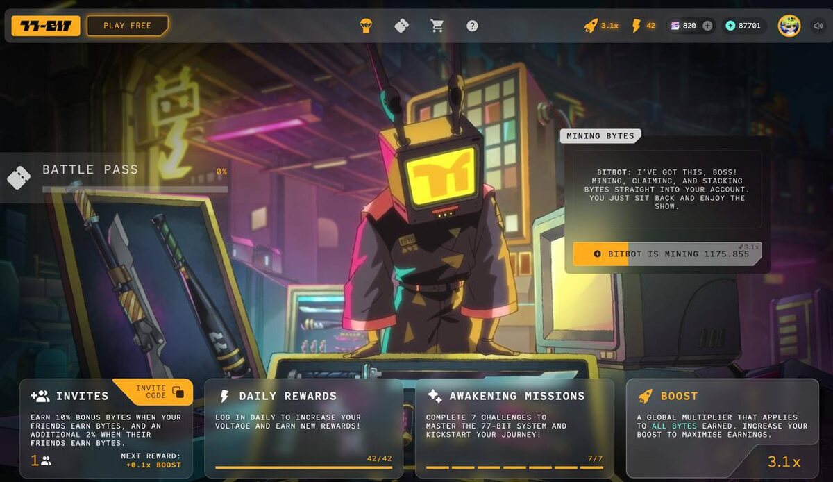 77-Bit — это киберпанковый мир с прокачкой, боями и возможностью зарабатывать. И, что самое интересное, проект работает на блокчейне Abstract, который сам по себе является перспективной платформой. Участвуя в игре, мы не только фармим полезные активы, но и параллельно можем получить бонусы от Abstract-чейна.