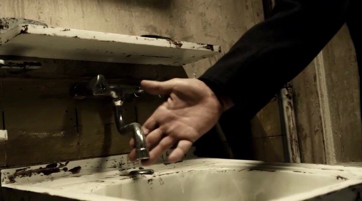 Он проходит на кухню, крутит вентиль над раковиной, и тут раковина отъезжает в сторону, и хитрый киллер попадает в зону евроремонта.