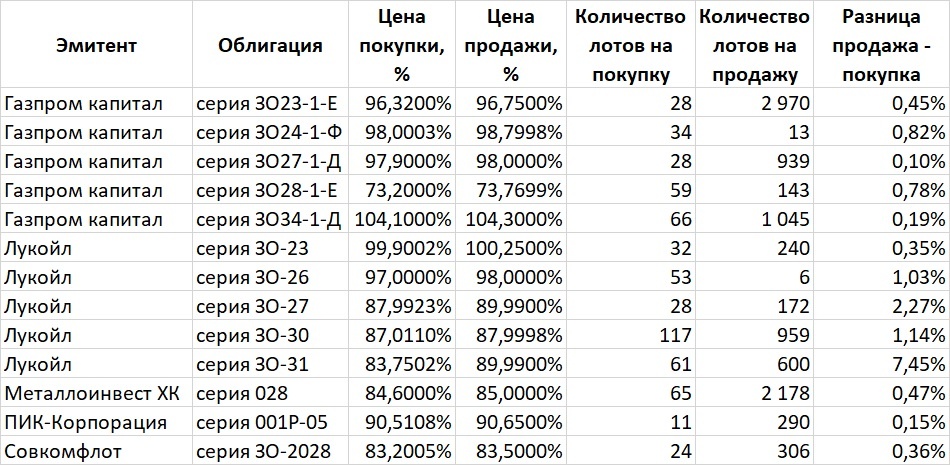 Для того чтобы купить несколько облигаций по лучшей цене я потратил 3 торговых дня. Т.е. инвесторам с относительно большим капиталом этот инструмент не подойдет. Но для желающих купить несколько лотов - это остается неплохой инструмент. Но важно понимать, что в моменте вы их не продадите - скорее всего придется несколько дней вылавливать хорошую цену.