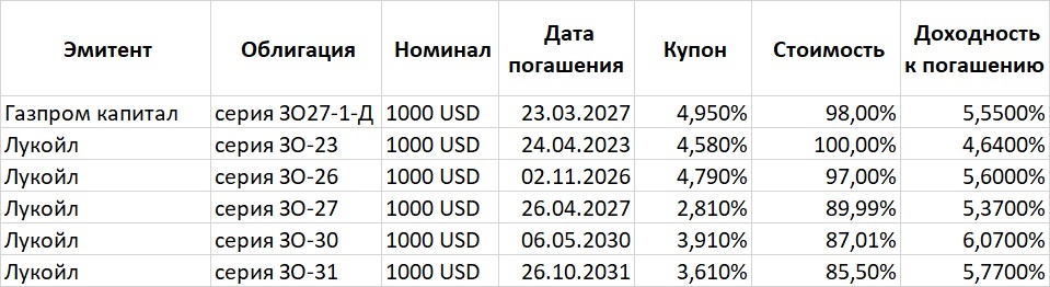 Итого мы видим доходность на уровне 5,5 - 6% в долларах, которую можем зафиксировать срок до 9 лет. Или просто можем купить облигацию с гашением через пол года с доходностью 4,6%.