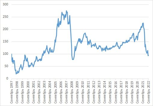 А что с сегодняшней ценой индекса? 93 пункта в ценах 1997 года - много ли это если посмотреть на график? Хуже ли сегодняшняя ситуация 1998 - 2000 годов? Или 2008 года? Если смотреть с точки зрения экономики - здесь однозначного ответа нет. В те времена все жили в ожидании роста и развития экономики, а сегодня мы живем в состоянии максимальной неопределенности с очевидными ожиданиями к падению на ближайшие годы и удержится ли российский рынок на текущих ценах - это вопрос без ответа. Все будет зависеть от того, куда дальше пойдет наша история...