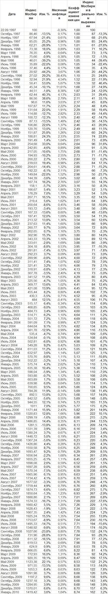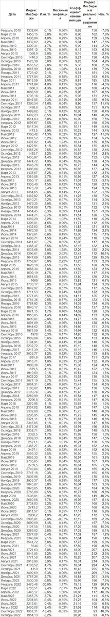 Получили достаточно ненаглядные таблицы из которых можем посмотреть данные за всю историю индекса Мосбиржи. Примечательно, что инфляционный коэффициент за это время составил почти 21, т.е. цены с сентября 1997 по октябрь 2022 увеличились в 21 раз.