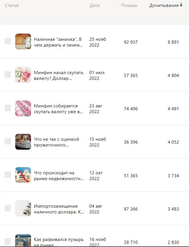 Хорошо читаются темы по недвижимости и по валюте. И чем более громко выглядит заголовок, тем больше прочтений. В общем массового читателя сильно волнует, что будет с рублем и сколько будут стоить квадратные метры. Тема валюты, пожалуй, принесла большую часть подписчиков.