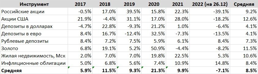 Сравнение доходности различных инвестиционных инструментов в 2017 - 2022 годах, в рублях