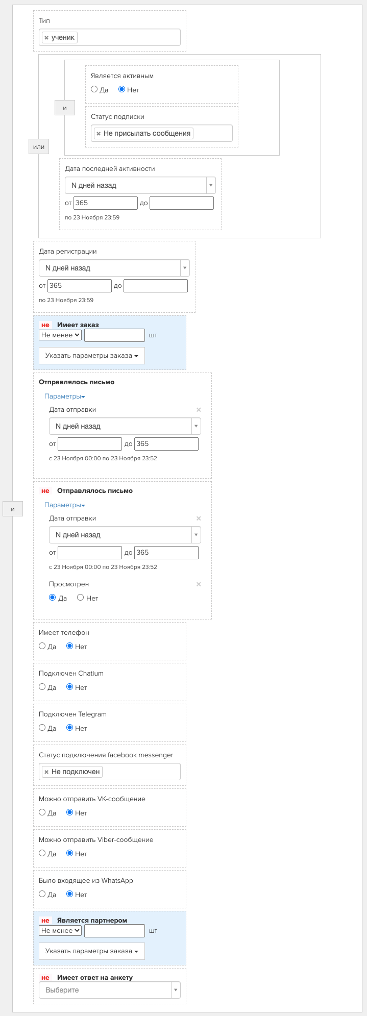 Важно! Если вы используете лендинги/страницы на сторонних площадках или база пользователей была импортирована, не стоит использовать в выборке условие "Дата последней активности".