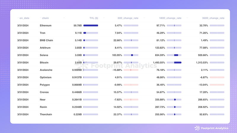 As March wrapped up, the total market cap of public chain cryptocurrencies stood at $2.2 trillion, marking a 15.8% rise from February. Leading this growth were Bitcoin, Ethereum, BNB Chain, and Solana, with market shares of 63.2%, 19.7%, 4.2%, and 4.1%, respectively.