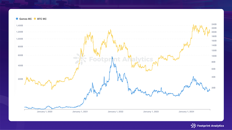 As of August 2024, the market cap of blockchain gaming tokens stood at $15.83 billion, representing 1.36% of Bitcoin’s market cap during the same period. This is a significant decline from the peak of $98.68 billion on November 26, 2021, marking an 83.96% reduction. The highest market cap for blockchain gaming tokens in this cycle was $41.04 billion on March 14, 2024, which still fell short of the previous cycle’s peak.