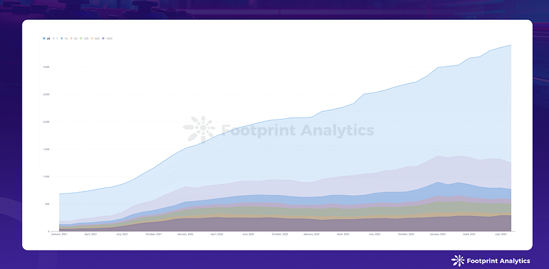 On the other hand, despite the surge in the number of blockchain games from less than 700 in January 2021 to 3,402 by August 2024, the active player base growth has not kept pace. Games with over 1,000 monthly active users (MAU) increased from 45 in January 2021 to 291 in August 2024, but this remains below 9% of the total games. This discrepancy can be attributed to incomplete on-chain data and a concentration of traffic on a few star games, creating a “head effect.”