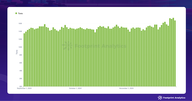 Transaction metrics reveal a more complex picture. While daily transactions averaged 15.3 million (up 3.3% from October), the daily transactions per user ratio declined from 3.131 to 2.810. With total monthly transactions holding steady at 460.4 million, the data suggests new users may be engaging less intensively with blockchain features than earlier adopters.