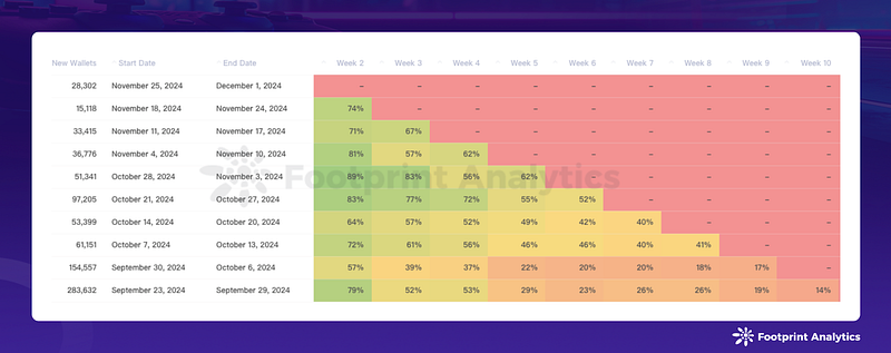 TON’s ecosystem faced challenges with a 41.9% decline to 116.4K DAU, highlighting the retention challenges in Telegram-based games. But the industry always has some exceptions. Sui’s average DAU in November was 233.3K, 23.1% increased from last month. The Telegram game BIRDS has contributed most of the user base, with average DAU 224.9K, and its weekly new user retention is one of the industry-level examples.