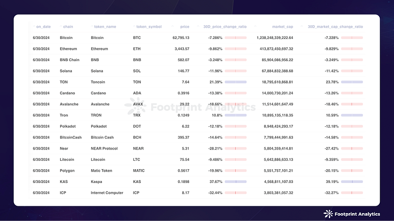 Despite a general decline in token prices throughout June, three tokens among the top 15 by market cap bucked the trend, experiencing gains in both price and market cap: Toncoin, TRON, and Kaspa.