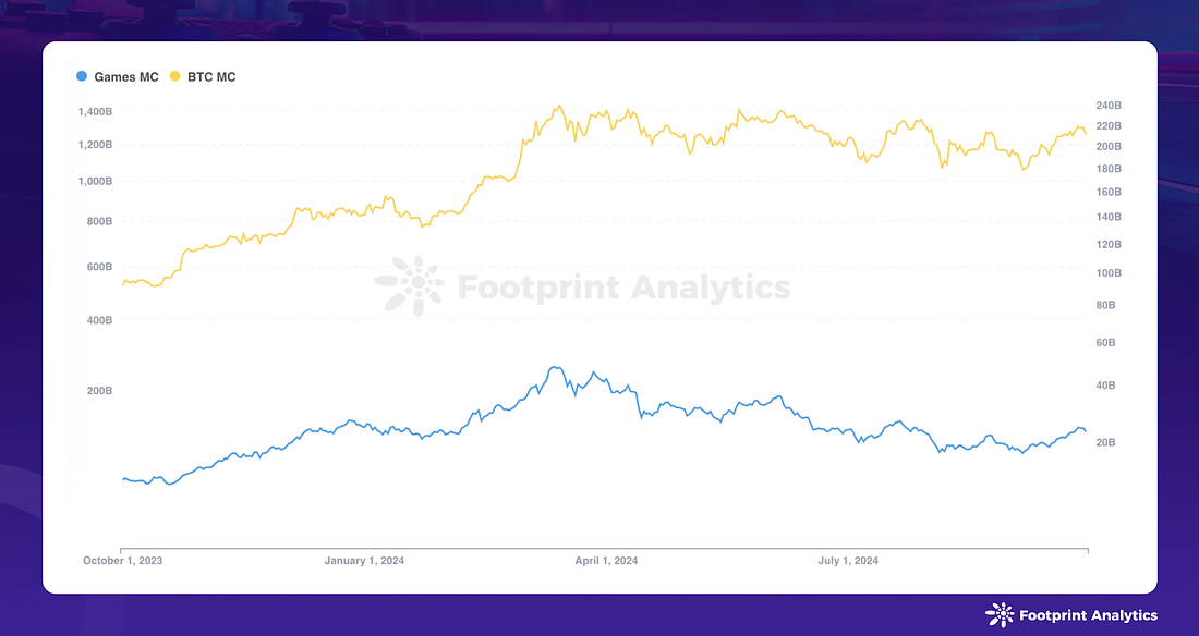 September witnessed a rebound in the Web3 gaming sector, aligning with the broader crypto market’s upward trend. The market cap of blockchain game tokens surged from $18.0 billion to $23.2 billion, marking a substantial 29.2% increase. This recovery, following last month’s considerable decrease, demonstrates the sector’s correlation with macro crypto market movements.