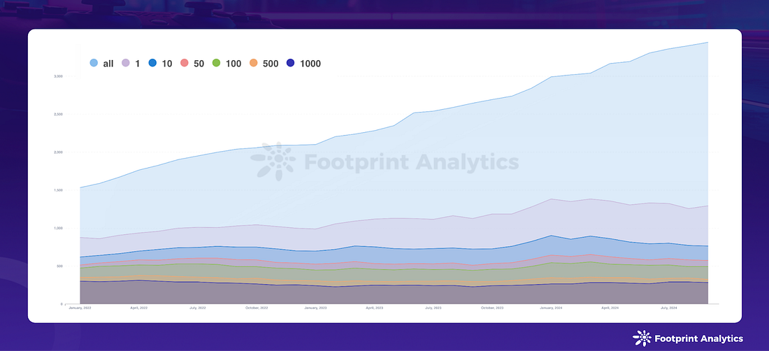 The blockchain gaming universe expanded to encompass 3,448 games, with 1,295 actively engaged. Significantly, 285 games attracted over 1,000 monthly active on-chain users (MAU), representing 8.3% of all games and 22.0% of active games. This distribution highlights the ongoing challenge of user retention and engagement in the blockchain gaming space.