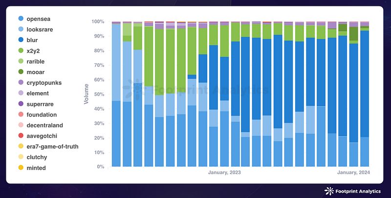 In February, Blur remained a dominant force in the NFT marketplace, despite a trading volume decrease to $613.2 million, managing to enhance its market share to 73.1% from January’s 68.3%. OpenSea, however, witnessed a marginal uptick in trading volume to $171.7 million but saw its market share increase to 20.5%, reversing its previous trend of decline. Mooar, on the other hand, experienced a significant downturn, with its trading volume plummeting to $12.3 million, drastically reducing its market share to 1.5% after a previous surge.