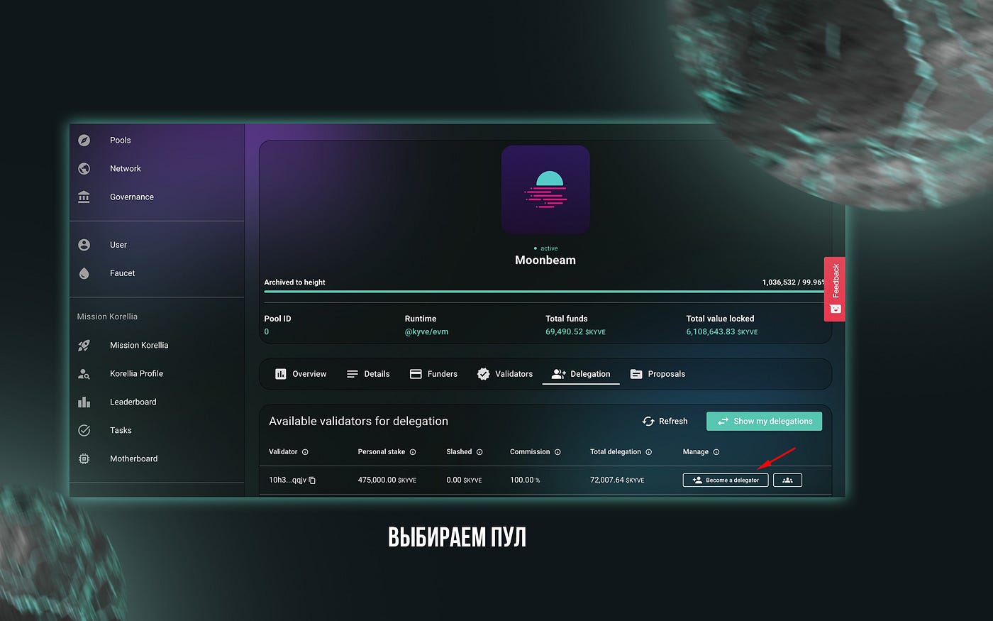 Переходим во вкладку “Pools” и здесь выбираем любой вас интересующий пул, например: Moonbeam