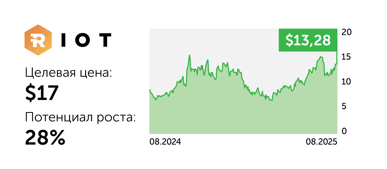 Riot Platforms (RIOT) специализируется на майнинге биткоина и развивает систему дата-центров. Приоритет компании – масштабирование высокопроизводительных вычислительных мощностей и эффективное управление энергозатратами. В июле Riot произвела 484 BTC. Выручка эмитента за последний отчетный квартал составила $153 млн, чистая прибыль – $219,5 млн, маржа EBITDA – 32%. В планах менеджмента к концу 2025 года увеличить хешрейт на 26%, также компания нацелена на монетизацию энергетических активов, минимизацию операционных расходов и рисков, связанных с затратами на недвижимость, регуляторными требованиями и спросом на дата-центры.