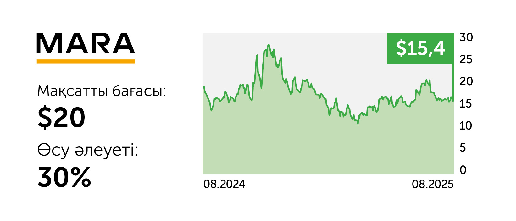 Әлемдегі жетекші биткоин майнерлерінің бірі MARA Holdings (MARA) АИ-сегментін дамыту және өнімділігі жоғары есептеу (HPC) бағыты есебінен бизнесті әртараптандырады. Компанияның ІІ тоқсандағы кірісі 64% ж/ж өсті, EBITDA (түз.) он еседен астам ұлғайды, таза пайда $808 млн. асты. Бір BTC-ті өндіруге жұмсалатын энергия шығыны $33,7 мыңға дейін қысқарды. Негізгі мультипликаторлар бойынша бағаланбау эмитентті ұзақ мерзімді инвестициялар үшін тартымды етеді. Оның акцияларының өсу әлеуеті АИ және HPC-сегменттерін дамыту, орнықты операциялық тиімділік пен 50 639 биткоин резервінің арқасында іске асырылатын болады.