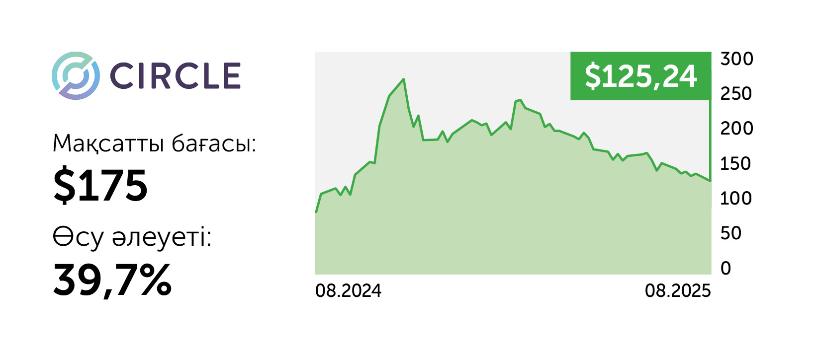 Circle (CRCL) - АҚШ долларының құнына байланған USDC стейблкоинінің эмитенті және блокчейн-инфрақұрылымын әзірлеуші. 2025 жылғы маусымда IPO-ға эмитент $1 млрд. астам қаржы тартты. II тоқсанда Circle кірісі 53% -ға, $658 млн. дейін ұлғайды. Айналыстағы USDC көлемі 90% -ға артып, $61,3 млрд болды, ал 10 тамызға $65,2 млрд. жетті. Стейблкоиндер туралы заңның (GENIUS Act) күшіне енуі компанияның өзекті бизнес-моделін заңдастырады, бұл USDC-нің дәстүрлі қаржы жүйесіне кірігу процесін айтарлықтай жеделдетеді. Қосымша оң нәтиже Corpay, Fiserv және Binance-пен серіктестікті, сондай-ақ капитал нарықтарына арналған Arc платформасын іске қосуды қамтамасыз етеді.
