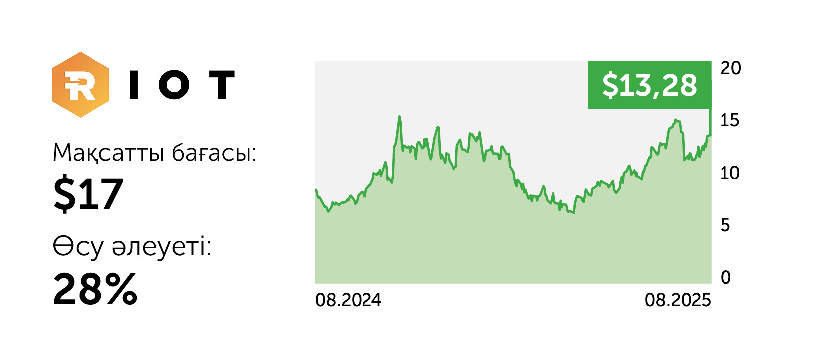 Riot Platforms (RIOT) биткоин майнингіне маманданған және дата-орталықтар жүйесін дамытады. Компанияның басымдығы – өнімділігі жоғары есептеу қуаттарын кеңейту және энергия шығындарын тиімді басқару. Шілде айында Riot 484 BTC шығарды. Эмитенттің соңғы есепті тоқсандағы кірісі $153 млн, таза пайдасы – $219,5 млн, EBITDA маржасы – 32% құрады. 2025 жылдың соңына қарай менеджмент жоспарларында хешрейтті 26% -ға ұлғайту көзделген, сондай-ақ компания энергетикалық активтерді монетизациялауға, жылжымайтын мүлікке жұмсалатын шығындарға, реттеуші талаптарға және дата-орталықтарға сұранысқа байланысты операциялық шығыстар мен тәуекелдерді азайтуға бағытталған.