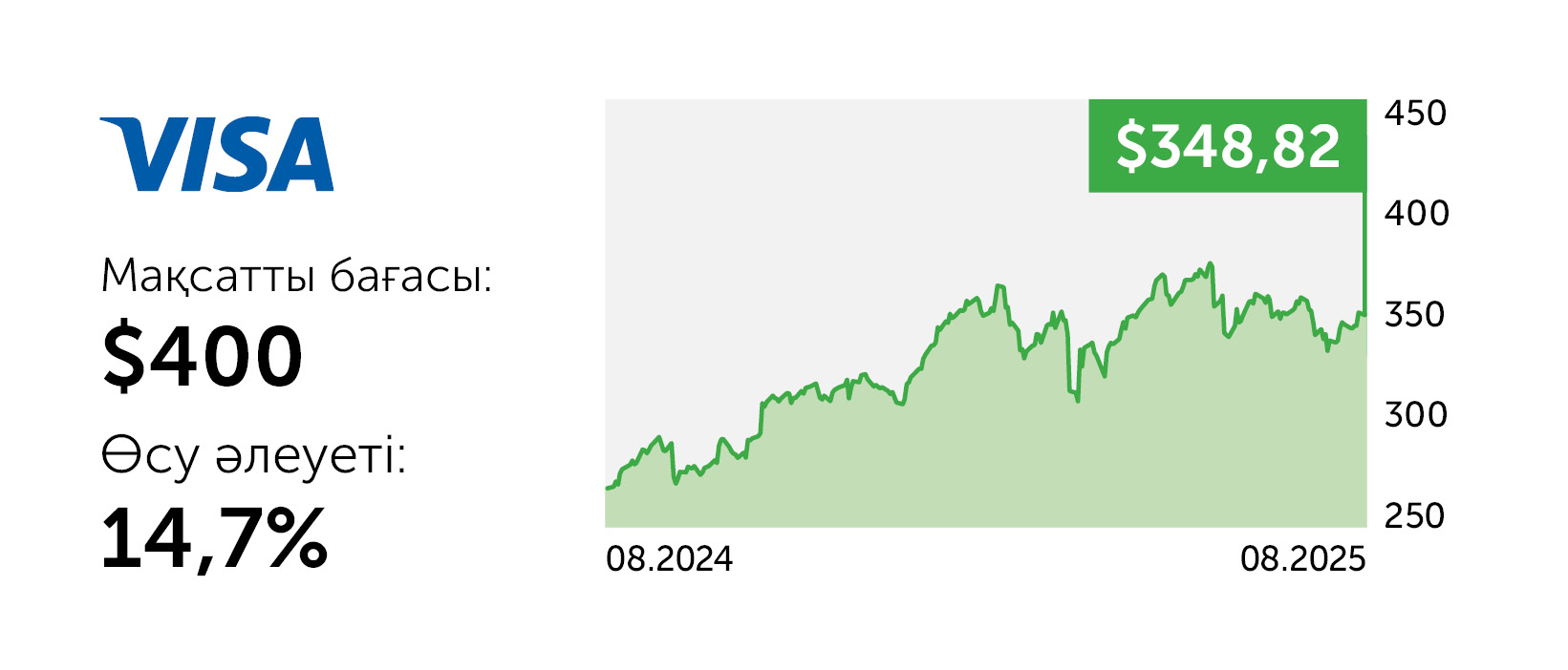 Visa (V) – $14 трлн астам жылдық транзакция айналымы бар ірі халықаралық төлем жүйесі. Таяу болашақта банк карталарын стейблкоиндермен жаппай ығыстыру сандық валюталарды Visa экожүйесіне ықпалдастыру сценарийі шамалы, неғұрлым шынайы көрінеді. Бұл ретте корпорация USDC инфрақұрылымына белсенді инвестициялауда және цифрлық валюталар үшін API-ді дамытуда. Компанияның бизнесі таза маржа 50% -дан жоғары болғанда екі мәнді өсу қарқынын тұрақты түрде көрсетеді. Эмитенттің акциялары үшін оң драйверлер блокчейн-шешімдерді интеграциялау, қолма-қол ақшасыз төлемдер көлемін ұлғайту және кері сатып алудың ауқымды бағдарламалары болып қала береді.