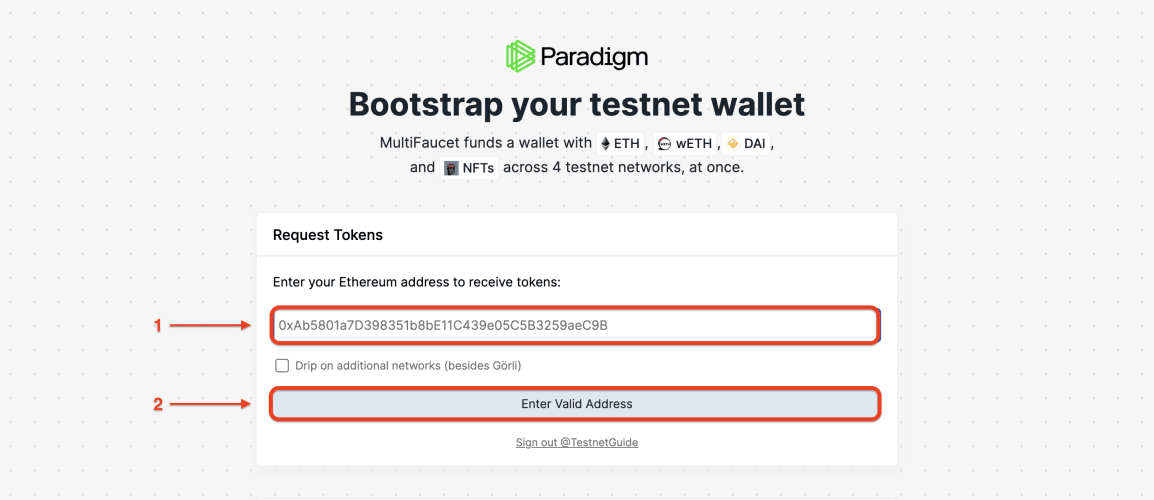 - Посетите Alchemy Faucet или Paradigm MultiFaucet, Avalanche укажите свой кошелек и запросите токены ETH testnet, AVAX.