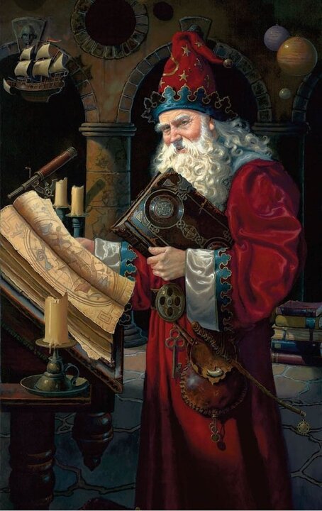 Шляпу такую мы видели и в "Гарри Поттере", например, и во "Властелине Колец" на Гендальфе-Сером. Шляпа – это уже колдовской её атрибут, когда истинное понимание процессов пропало и вместо Сказочников и Звездочëтов стали появляться волшебники-заклинатели, чароплеты, чародеи, кудесники и колдуны.
