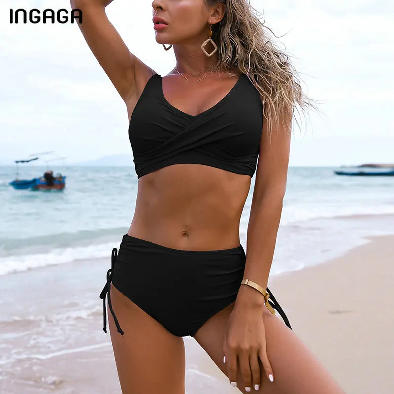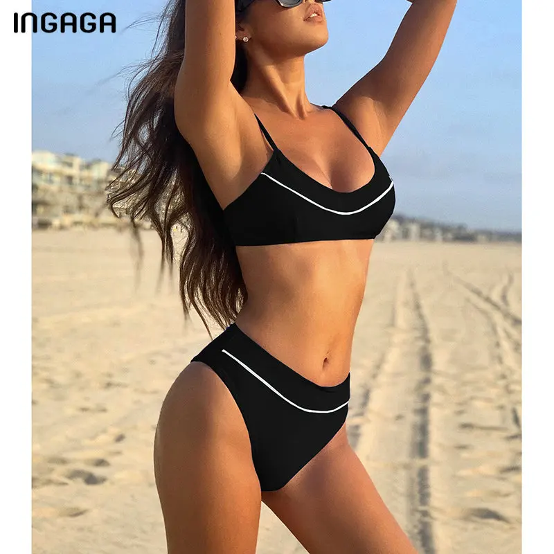 ✅ Бикини пуш-ап INGAGA с завышенной талией, пикантные купальники на бретелях, женская пляжная одежда с высокими штанинами, черное бикини, новинка...