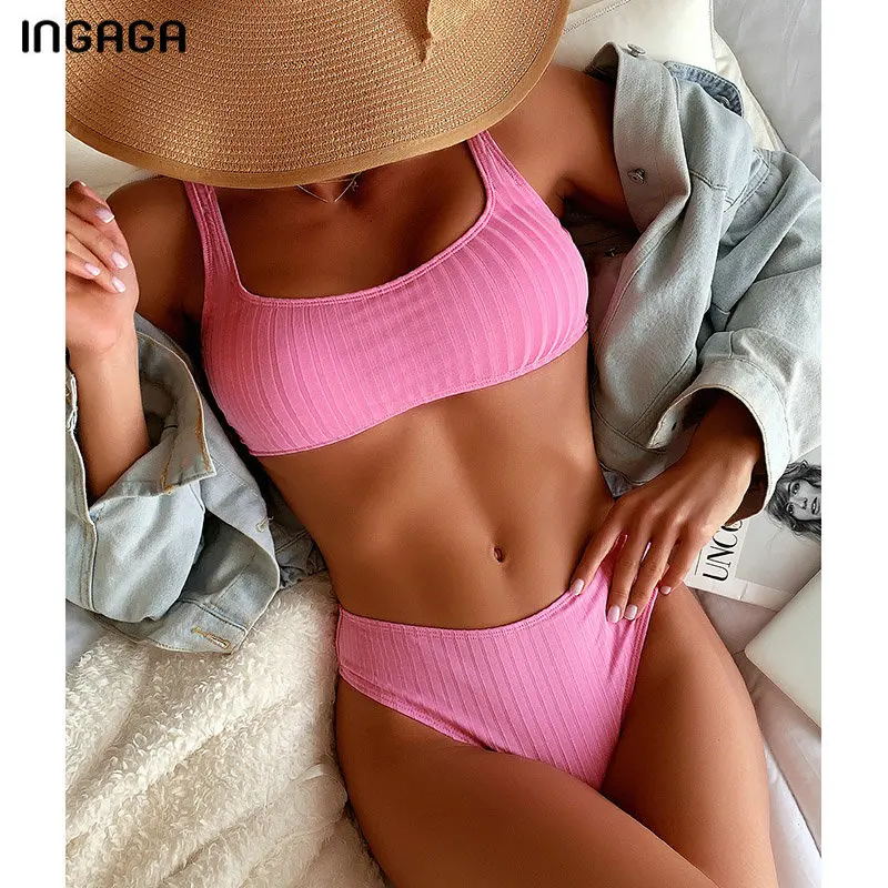 ✅ Бикини пуш-ап INGAGA, пикантные купальники с высокой талией, купальники, женское однотонное розовое бикини в рубчик, купальные костюмы 2021, пляжная одежда-бандо