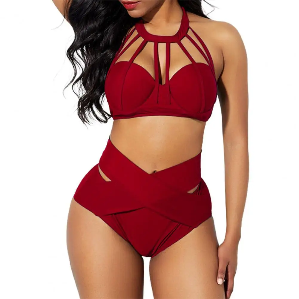 ✅ Женский купальный костюм, бикини, набор, Одноцветный Цвет с лямкой на шее бюстгальтер Высокая талия Breifs выдалбливают бюстгальтер женский купальник-бикини, плавательный бассейн размера плюс