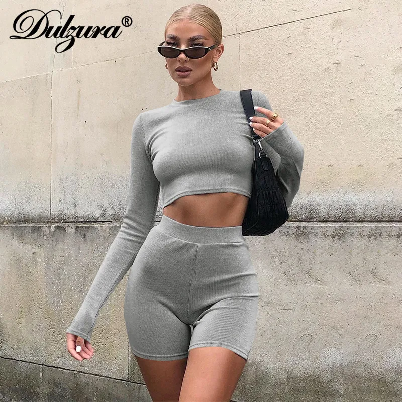 ✅ Женский комплект из двух предметов в рубчик Dulzura, укороченный Топ с длинным рукавом, велосипедные шорты с высокой талией, облегающий пикантн...