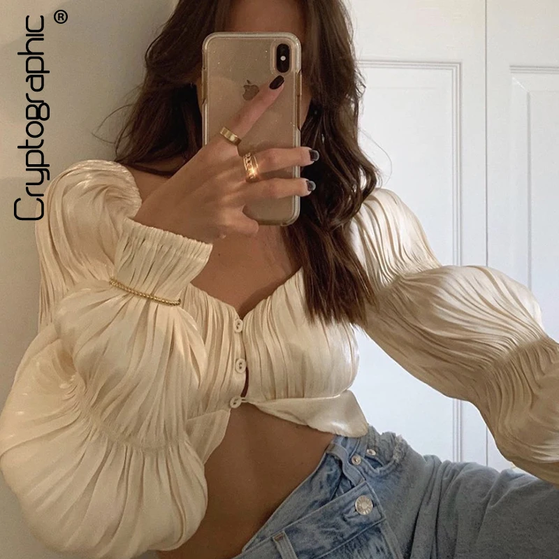 ✅ Женская блузка с рюшами Cryptographic, модный элегантный топ с рукавами-фонариками, открытыми плечами и пуговицами, 2020