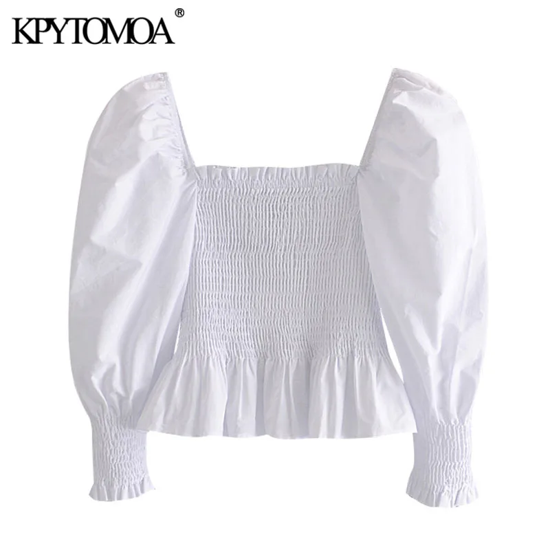 ✅ KPYTOMOA, женская, 2020, милая, модная, эластичная, укороченная, блузки, винтажные, рукав-фонарик, с оборками, подол, женские рубашки, шикарные топы