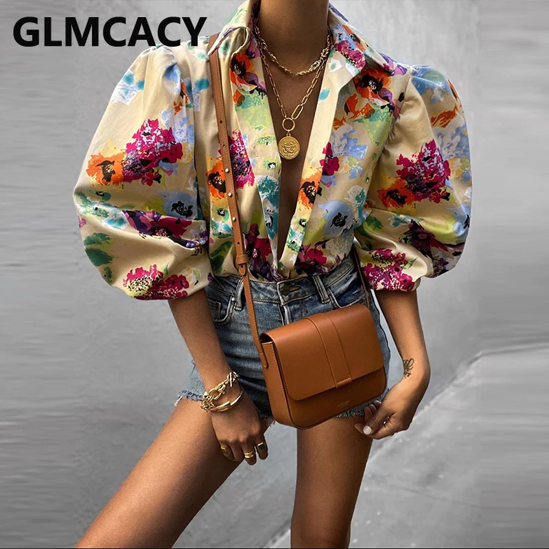✅ Осенняя женская элегантная блузка с V-образным вырезом и принтом, рубашка, новинка 2020, повседневные топы свободного кроя с длинным рукавом, Ж...