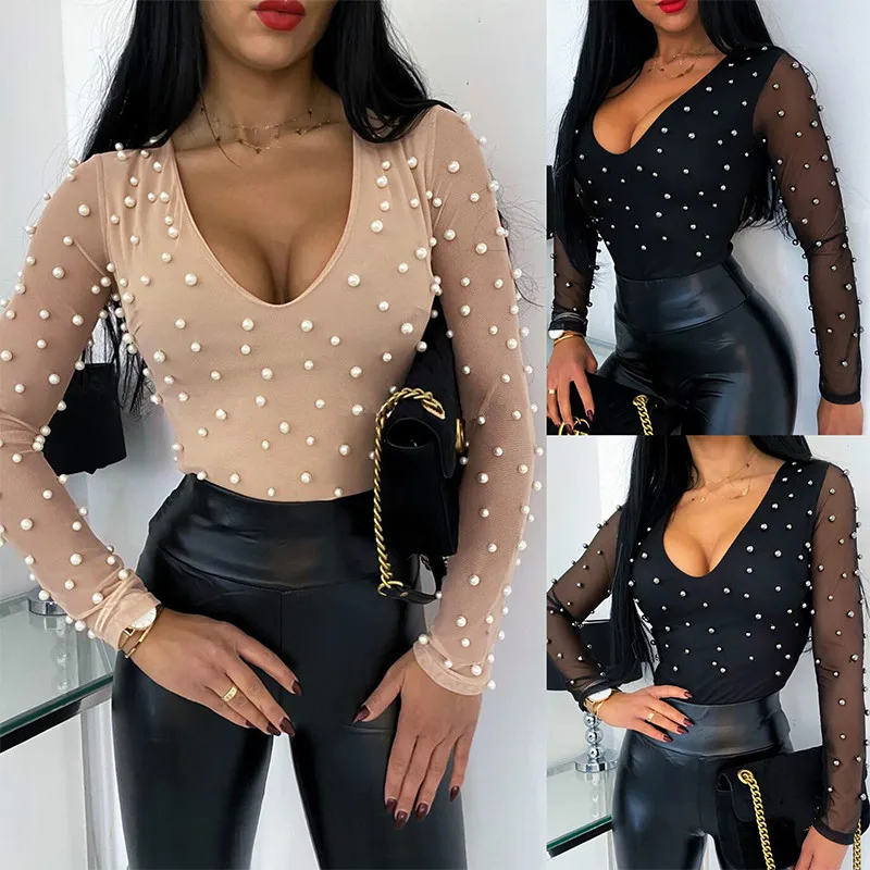 ✅ Модная сексуальная сетчатая Прозрачная облегающая женская блузка с бисером и глубоким вырезом, пикантные топы и рубашка, женская рубашк...