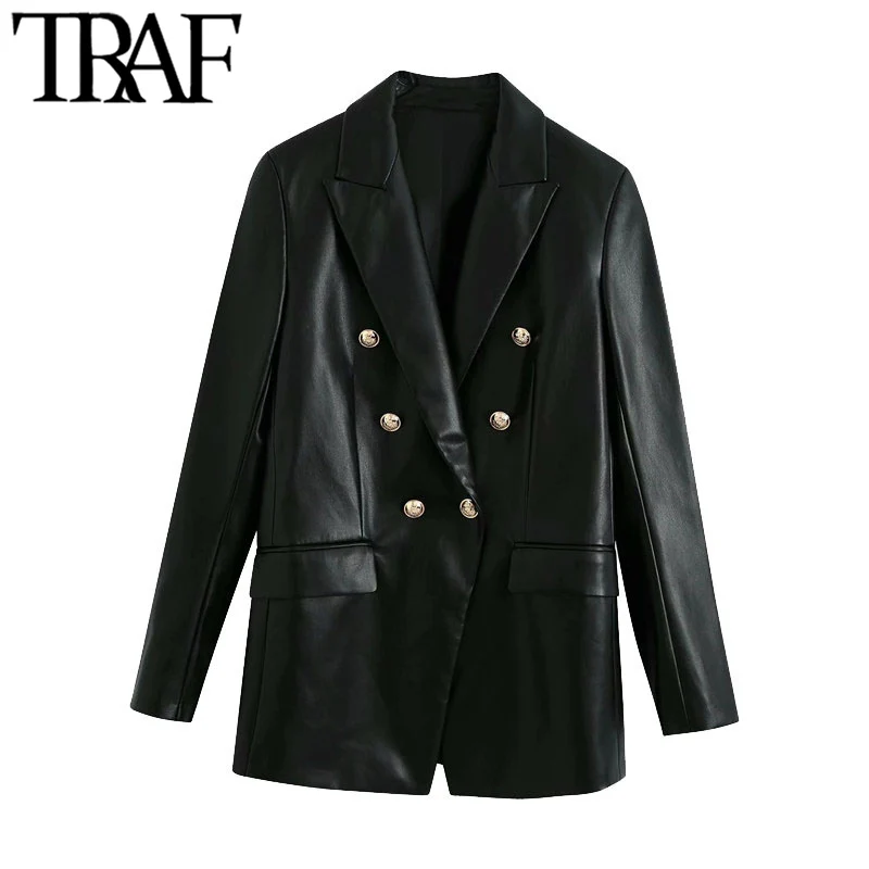 ✅ Женский двубортный пиджак TRAF, винтажный пиджак из искусственной кожи с длинным рукавом, верхняя одежда