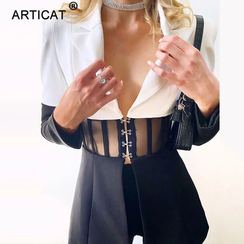 ✅ Женский блейзер с длинным рукавом Articat, белый блейзер с глубоким V-образным вырезом, сетчатый блейзер в стиле пэчворк для офиса на осень