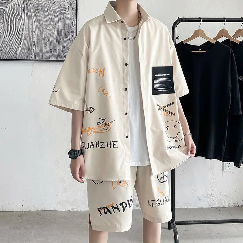 ✅ Рубашка с отложным воротником и короткими рукавами Мужская, повседневный уличный костюм из шорт с эластичным поясом, свободного покроя, 2 предмета, 5XL, INCERUN, 2021