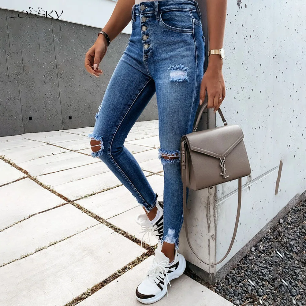 ✅ Женские джинсы с низкой посадкой, эластичные синие джинсовые рваные брюки с дырками, потертые обтягивающие брюки, джинсы для женщин, осення...