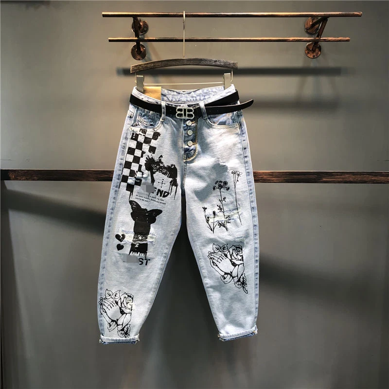 ✅ Женские рваные джинсы с высокой талией, повседневные свободные джинсовые шаровары с буквенным принтом, весна 2020, S679