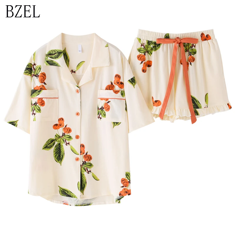✅ BZEL с цветочным принтом, женская одежда для сна, пижамный комплект, новинка, пижама из хлопка с карманами Пижама Femme высокого качества для женщин; Домашние тапочки для девочек, одежда для дома