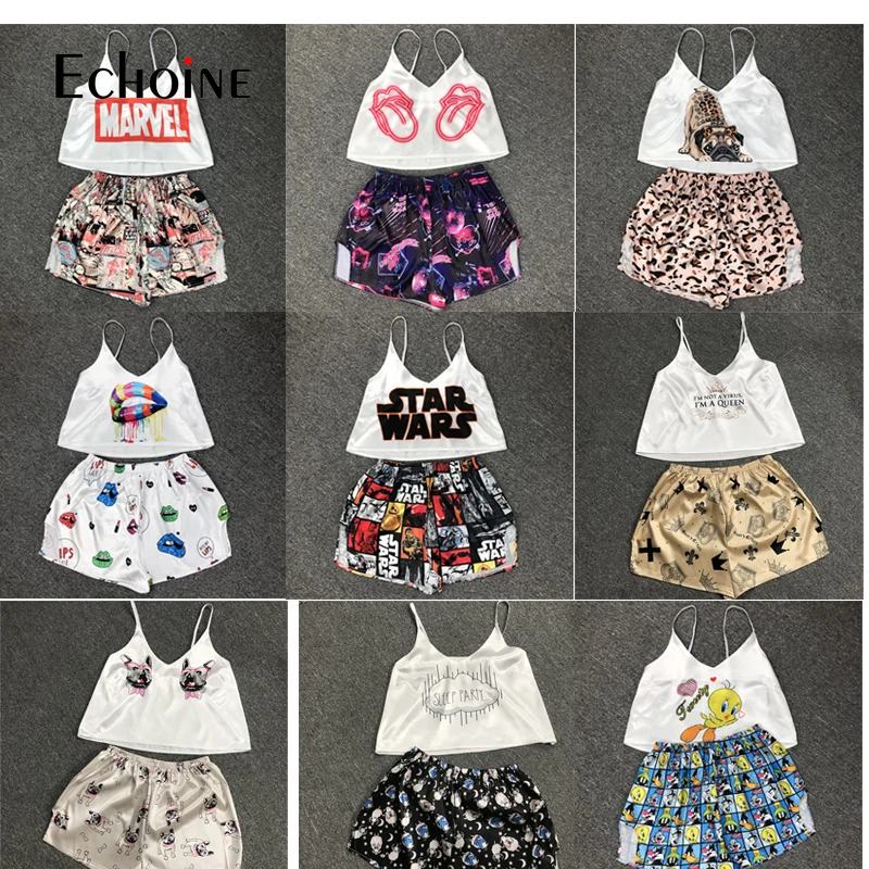 ✅ Echoine для женщин из двух частей комплект пикантные kawaii пижамы мультфильмов пижамные костюмы без рукавов с v-образным вырезом, короткий топ корсет атласная домашняя пижама одежды