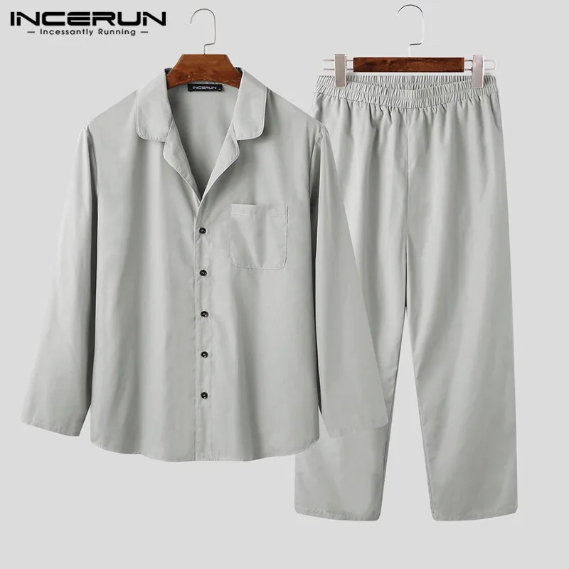 ✅ INCERUN пижамный комплект для мужчин, модная одежда для сна с длинным рукавом и отворотом, повседневные брюки, домашняя одежда, однотонные уютн...