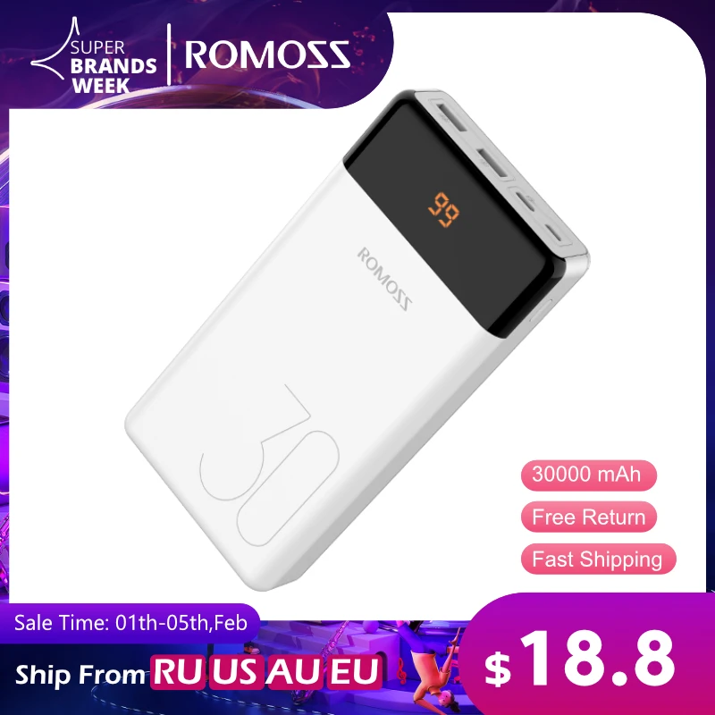 ✅ ROMOSS LT30 Повербанк 30000 мАч USB Type C 30000мАч Пауэр банк Внешние аккумуляторы повер банк для телефона для Xiaomi Mi 9 8 11 iPhone 12 Pro